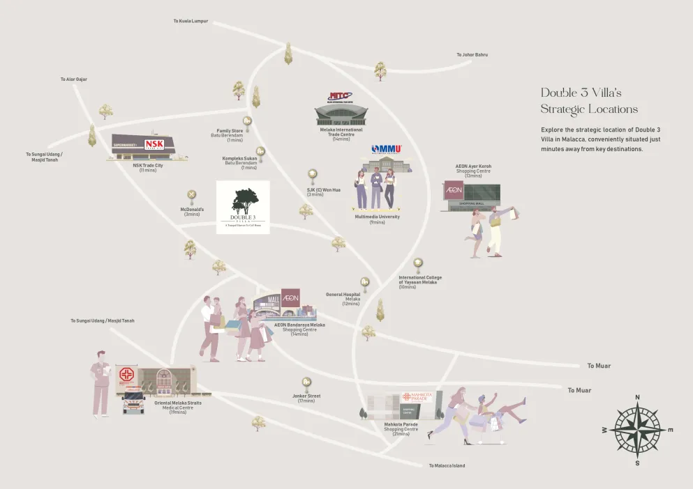 Explore the strategic location of Double 3 Villa in Malacca, conveniently situated just minutes away from key destinations.